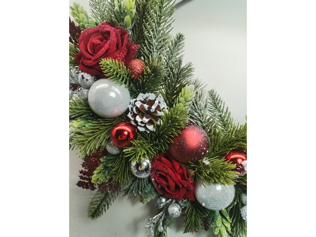 Elegantní vánoční věnec na dveře nebo stěnu, který okamžitě navodí tu pravou sváteční atmosféru. Základ tvoří proutěný korpus o průměru 30 cm, doplněný bohatým umělým jehličím, květinami, šiškami a ozdobami.